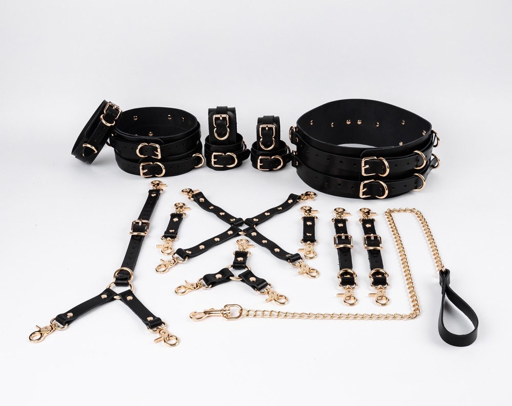 16 Piece BDSM Restraint Set, Different Color and Hardware Options, Waist Belt and Thigh Cuffs, Real Cowhide Leather.